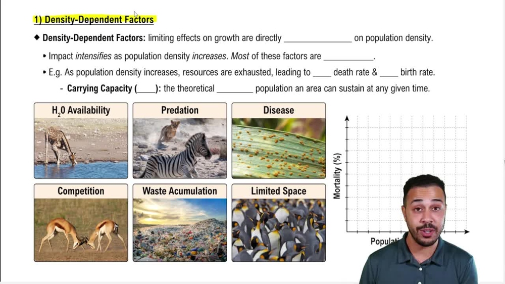Density-dependent factors are environmental influences that affect a population's growth in relation to its density. These include competition for resources, predation, disease, and waste accumulation. As population density increases, these factors become more pronounced, contributing to a decrease in the growth rate as the population approaches carrying capacity.