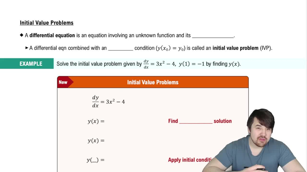 An initial value problem specifies a differential equation along with a condition at a particular point, such as p(1) = 0. Solving an IVP involves finding the general solution and then using the initial condition to determine the specific constant.