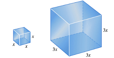 Answer each question. If the lengths of the sides of a cube are tripled, by what factor will the volume change?