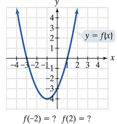 To find the missing function values indicated by question marks, look at the corresponding x-values below the graph and trace vertically to the graph line to find the y-values.
