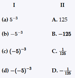 Step 2: Evaluate each expression in Column I by applying the negative exponent rule and considering the sign carefully. For example, for \$5^{-3}\(, rewrite it as \)\frac{1}{5^3}$.