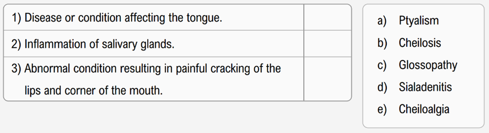 Glosso signifies the tongue, easily remembered by picturing a "glossy tongue." The terms sialo and tyalo both connect to saliva and salivary glands, with "sialo" referring specifically to saliva or the glands, and "tyalo" emphasizing the process of salivation, as in "salivating on tile."