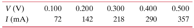 A sequence of potential differences V is applied across a wire ( diameter = 0.32 mm, length = 11cm) and the resulting currents I are measured as follows: Plot I vs. V. Based on this plot, can you conclude that the wire obeys Ohm’s law (i.e., did you obtain a straight line with the expected y-intercept, within the values of the significant figures)? If so, determine the wire’s resistance R.