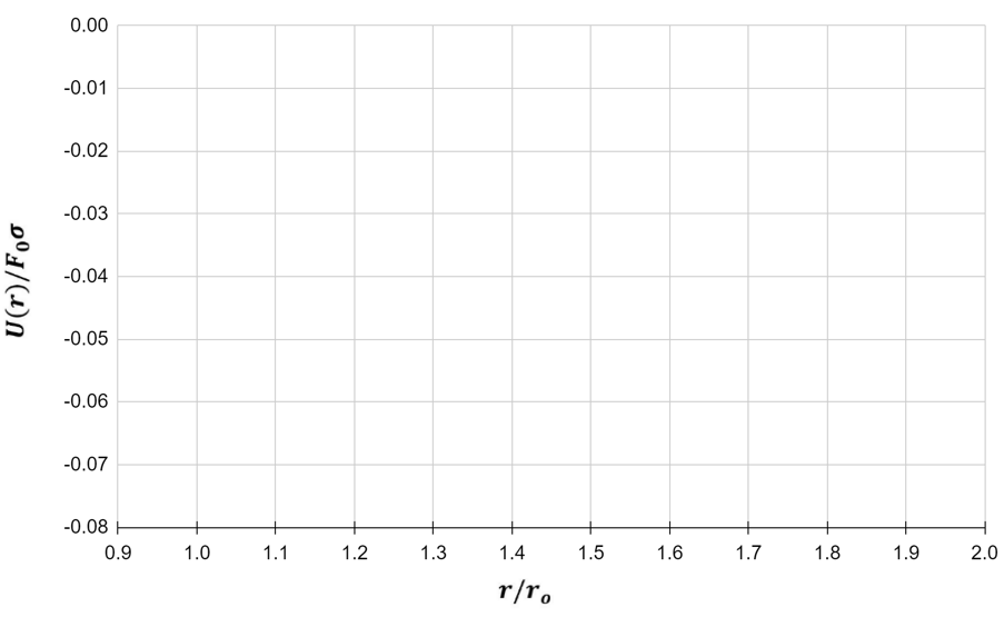 The interaction between two fluorine atoms in a diatomic molecule is described by the Lennard-Jones force F(r)=F0[2(σ/r)13−(σ/r)7] , where r is their separation distance, and σ and F0 are constants that characterize fluorine (F0=1.00×10−10 N, σ=3.15×10−11 m). Create the graph of the potential energy U(r) for distances ranging from 0.9r0 to 2.0r0, where r0 denotes the equilibrium separation distance between the atoms.