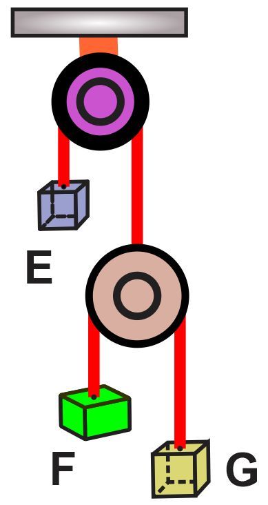 aE=mEmF+mEmG−4mFmG4mFmG+mEmF+mEmGg,aF=3mEmF−mEmG−4mFmG4mFmG+mEmF+mEmGg,aG=mEmF+3mFmG+4mFmG4mFmG+mEmF+mEmGga_{\(\mathrm{E}\)}=\(\frac{m_{\mathrm{E}\)}m_{\(\mathrm{F}\)}+m_{\(\mathrm{E}\)}m_{\(\mathrm{G}\)}-4m_{\(\mathrm{F}\)}m_{\(\mathrm{G}\)}}{4m_{\(\mathrm{F}\)}m_{\(\mathrm{G}\)}+m_{\(\mathrm{E}\)}m_{\(\mathrm{F}\)}+m_{\(\mathrm{E}\)}m_{\(\mathrm{G}\)}}g,a_{\(\mathrm{F}\)}=\(\frac{3m_{\mathrm{E}\)}m_{\(\mathrm{F}\)}-m_{\(\mathrm{E}\)}m_{\(\mathrm{G}\)}-4m_{\(\mathrm{F}\)}m_{\(\mathrm{G}\)}}{4m_{\(\mathrm{F}\)}m_{\(\mathrm{G}\)}+m_{\(\mathrm{E}\)}m_{\(\mathrm{F}\)}+m_{\(\mathrm{E}\)}m_{\(\mathrm{G}\)}}g,\(\quad\) a_{\(\mathrm{G}\)}=\(\frac{m_{\mathrm{E}\)}m_{\(\mathrm{F}\)}+3m_{\(\mathrm{F}\)}m_{\(\mathrm{G}\)}+4m_{\(\mathrm{F}\)}m_{\(\mathrm{G}\)}}{4m_{\(\mathrm{F}\)}m_{\(\mathrm{G}\)}+m_{\(\mathrm{E}\)}m_{\(\mathrm{F}\)}+m_{\(\mathrm{E}\)}m_{\(\mathrm{G}\)}}gaE=4mFmG+mEmF+mEmGmEmF+mEmG−4mFmGg,aF=4mFmG+mEmF+mEmG3mEmF−mEmG−4mFmGg,aG=4mFmG+mEmF+mEmGmEmF+3mFmG+4mFmGg