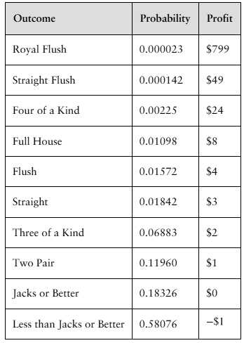 Identify the random variable and its possible values: Here, the random variable is the net winnings (profit) from a \$1 bet in video poker, with each outcome having a specific profit value and associated probability.