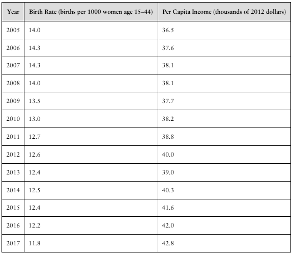 The data in the next column shows birth rate and per capita income (in thousands of 2012 dollars) from 2005 through 2017. Draw a time-series plot for both birth rate and per capita income. Comment on any trends.