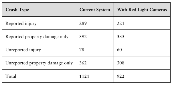 Step 2: Compare the total number of crashes in the first table. Note the total crashes under the current system (1121) and with red-light cameras (922). This comparison gives an initial indication of whether the cameras reduce overall crashes.