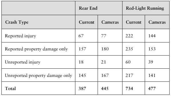 Step 3: Analyze the breakdown in the second table. For Rear End crashes, compare the totals under the current system (387) and with cameras (445). For Red-Light Running crashes, compare the totals under the current system (734) and with cameras (477). This helps identify which type of crashes increase or decrease with the cameras.
