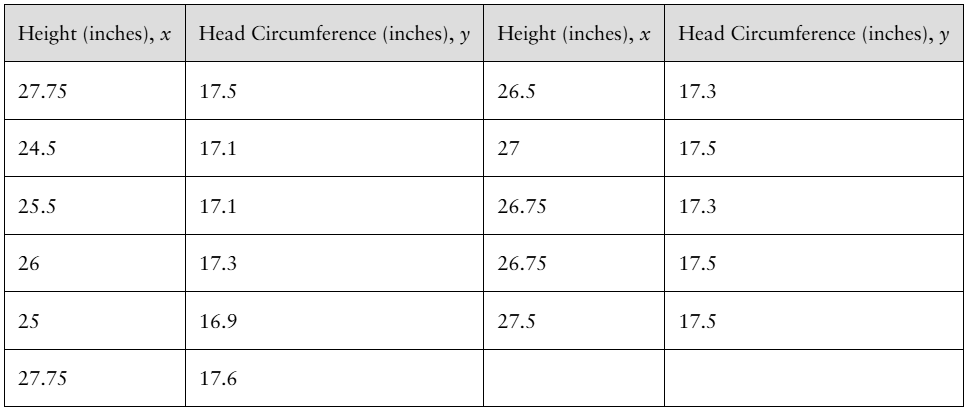 b. Suppose the researcher wanted to determine if there is a positive association between height and head circumference. What would be the null and alternative hypotheses?"