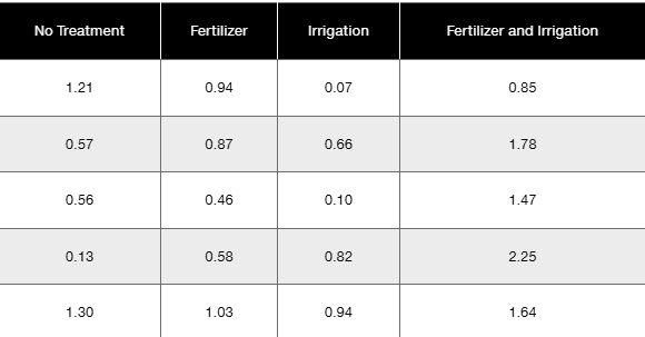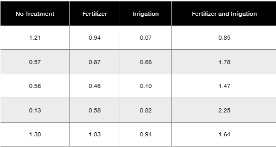c. Use the Bonferroni test procedure with a 0.05 significance level to test for a significant difference between the mean amount of the irrigation treatment group and the group treated with both fertilizer and irrigation. Identify the test statistic and either the P-value or critical values. What do the results indicate?