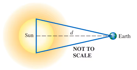 Solve each problem. See Examples 1–4. Diameter of the Sun To determine the diameter of the sun, an astronomer might sight with a transit (a device used by surveyors for measuring angles) first to one edge of the sun and then to the other, estimating that the included angle equals 32'. Assuming that the distance d from Earth to the sun is 92,919,800 mi, approximate the diameter of the sun.