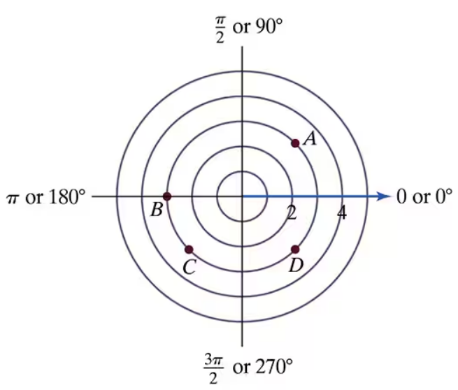 In Exercises 21–26, use a polar coordinate system like the one shown for Exercises 1–10 to plot each point with the given polar coordinates. Then find another representation of this point in which a. r>0, 2π < θ < 4π. b. r<0, 0. < θ < 2π. c. r>0, −2π. < θ < 0. (4, π/2)