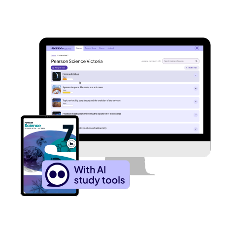 Explore Student Books, eBooks with AI study tools, Pearson Digital Hub and Student Companion books for the Victorian Curriculum Science V2.0.
