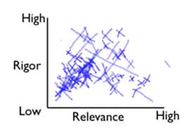 Later I used a Learning Catalytics "composite sketch" question. Students can use their mouse or touch screen to indicate a point or draw a line on their device. The results are aggregated into a single response by overlaying all the individual responses. To emulate a "classroom walkthrough" I shared a sample lesson and asked teachers to plot their perceptions of its rigor and relevance on an X / Y axis. The resulting overlay graph of the variance in their responses (at left) was a powerful discussion starter.