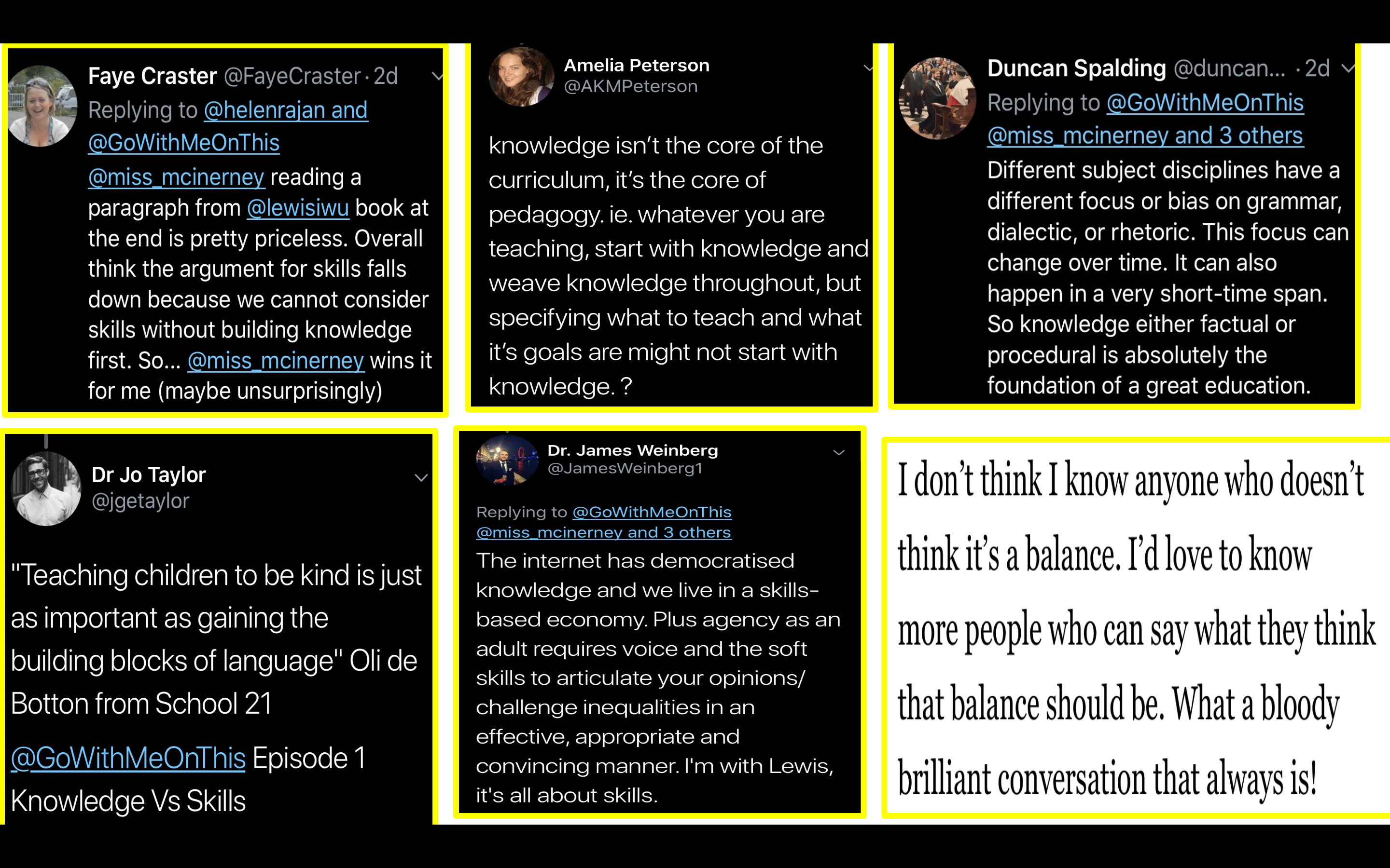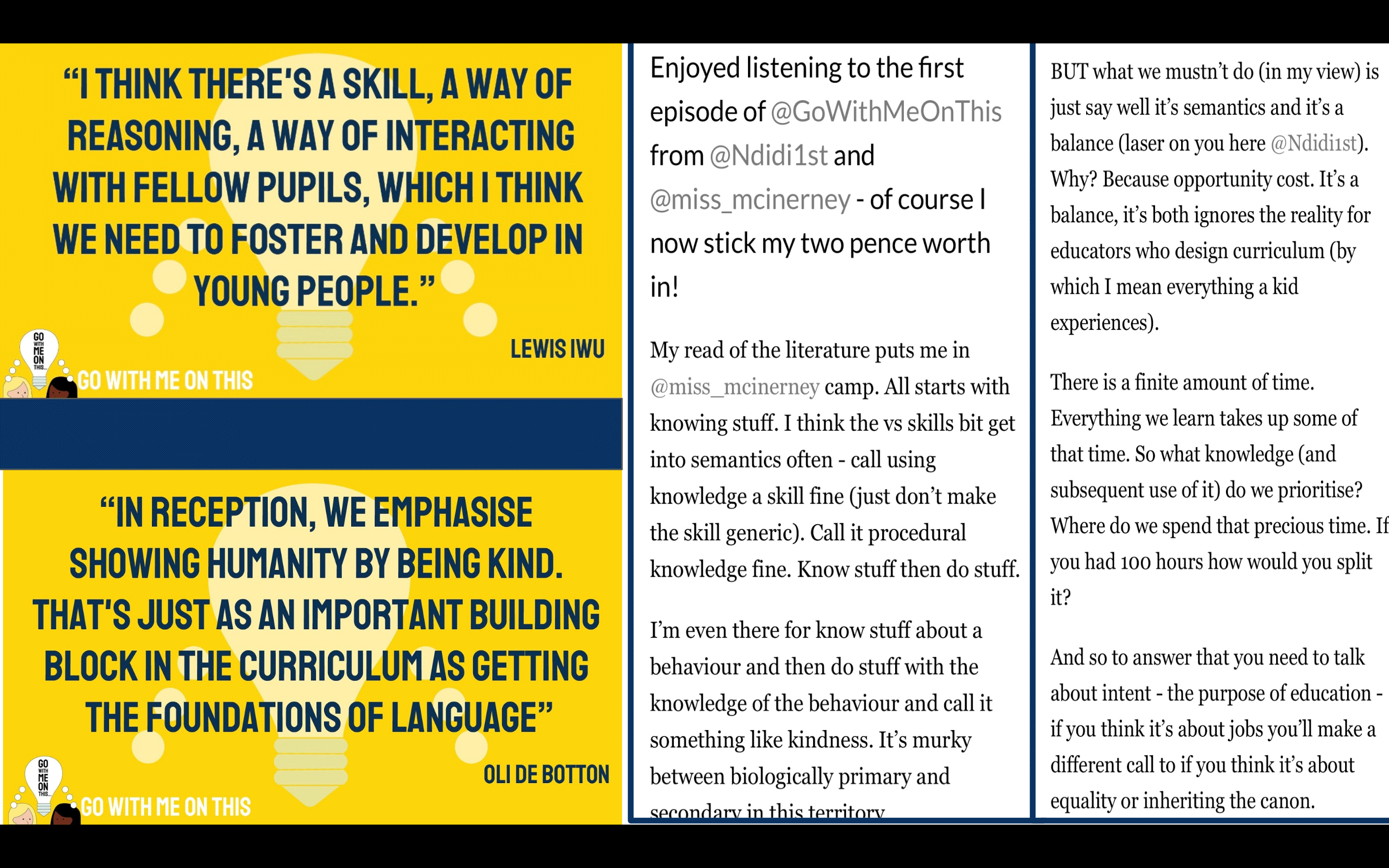 I entered the discussion, open to Laura’s idea that 'Knowledge should be the single biggest priority in a School’s Curriculum' - but I was also open to the view that there should be an explicit focus on an intentional development of skills. Our two guest hosts Oli De Botton, and Lewis Iwu made extremely compelling arguments for skills, and I often found myself swaying and seeing things from their perspective.