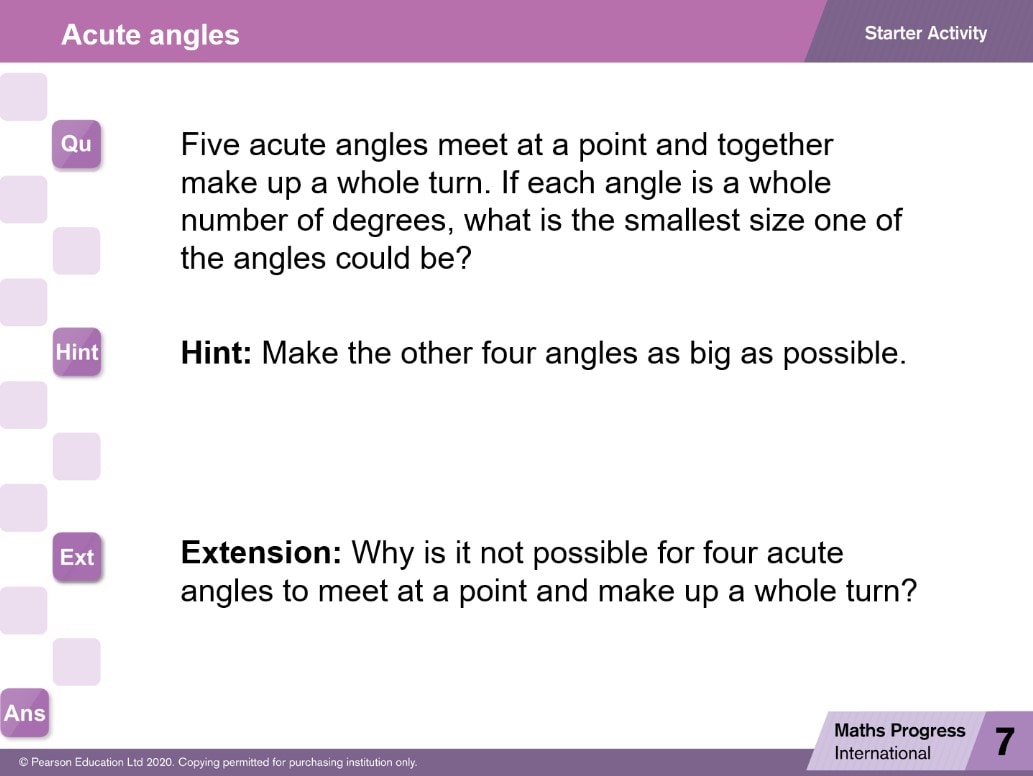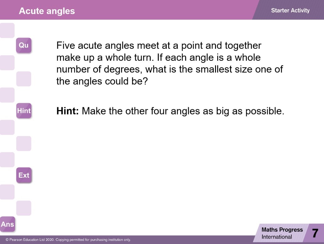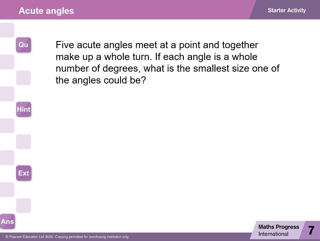 Each Maths Progress International lesson has a starter activity directly linked to the lesson content. Having this on screen as students join the lesson gives them something to focus on, and start them thinking mathematically.