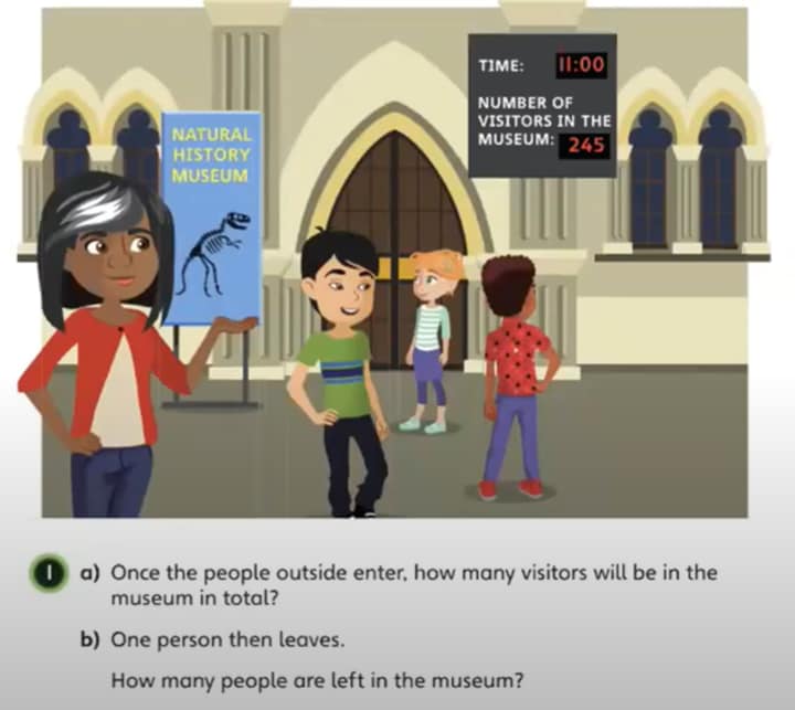At the same time you may be trying to cater for those who are ready to go into greater depth. Josh shows how you can go back to the ‘Discover’ (or it could be another section) and make up some extra, challenging questions based on the core idea of the lesson. In the example below, the context is people coming in and out of the museum, and the extra questions are long calculations.