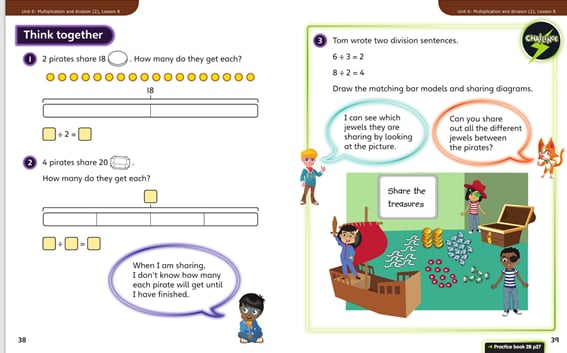 You can allow children to focus just on the question, and not worry so much about the scaffolded answer boxes, if you feel that would be helpful (for instance, if they are using a different method). And you may also feel you want to build confidence steadily and not take on the challenge question if children are finding it difficult. (The challenge question is designed to be accessible to all children who have worked through the preceding steps, i.e. it’s not a specifically ‘high-ability’ task, but that doesn’t mean every child has to do it.) In the ‘Think Together’ section, it’s vital that it’s the children doing the thinking, not the teacher.