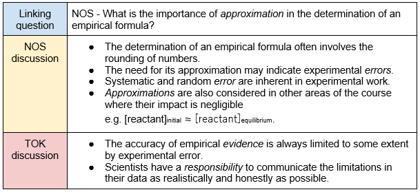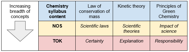 The following table gives examples of possible links between concepts in TOK, NOS and the chemistry syllabus content: