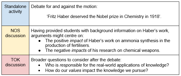 Although we are often conscious of time spent away from the syllabus content, it can be effective to integrate NOS and TOK in standalone activities. These activities can allow students to step back from the nitty gritty of the course details to gain big-picture conceptual understandings. For example: