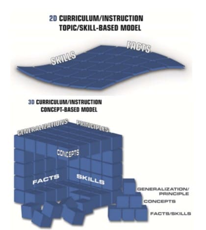 Note: For those curious to explore further, try reading H. Lynn Erickson’s position paper ‘Concept-based teaching and learning’, published in 2012 and available in the IB Programme Resource Centre. Erickson draws on two visual models to throw light on concept-based teaching and learning, contrasting a classic two-dimensional topic-based model with a three-dimensional one that frames facts and skills with concepts, generalisations and principles.