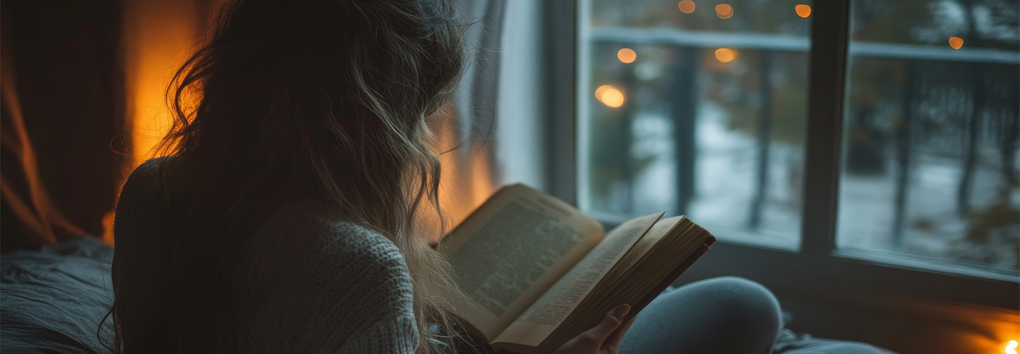 A man reading a book sat in a window